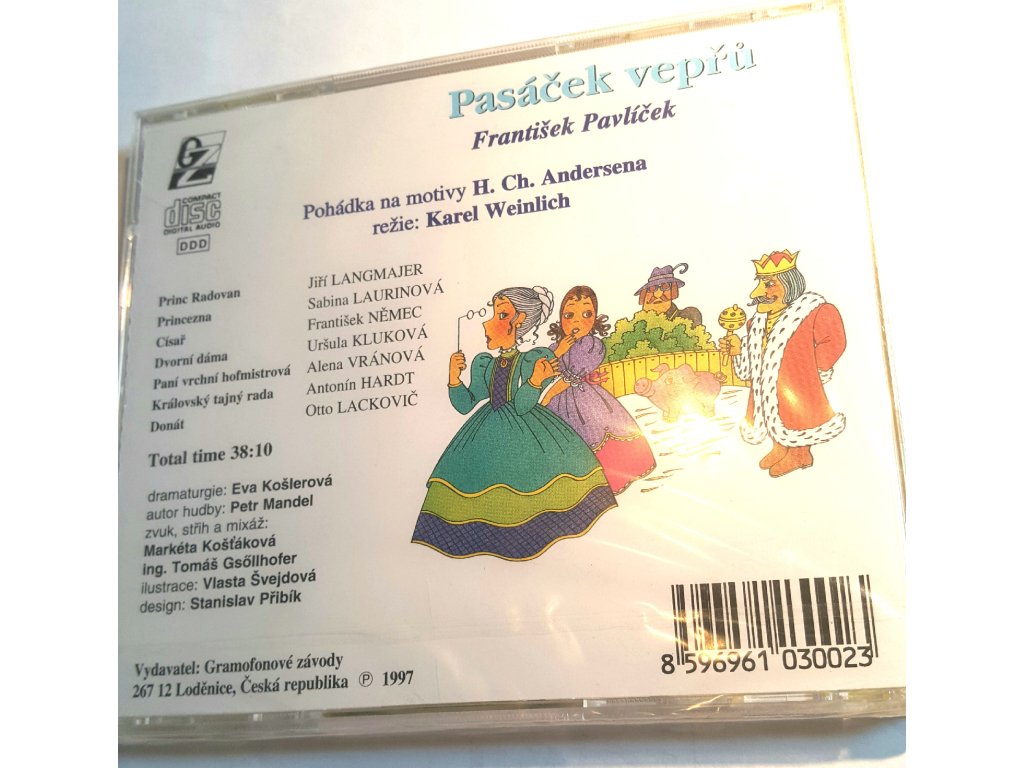 CD Pohádka- Pasáček vepřů, Pohádka na motivy H. Ch. Andersena Vypráví: František Pavlíček Princ Radovan: Jiří Langmajer Princezna: Sabina Laurinová Císař: František Němec Dvorní dáma: Uršula Kluková Vrchní hofmistrová: Alena Vránová Královský rada: Antonín Hardt Donát: Otto Lackovič Celkový čas: 38:10 minDoplňkové parametry