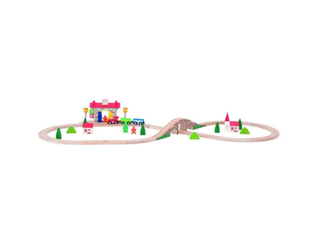 Dřevěná vláčkodráha Dřevěná vláčkodráha ve tvaru číslice osm je vybavena zvukovým nádražím na čip. Ve chvíli, kdy vlak projíždí stanicí, vydá čip charakteristický zvuky projíždějící lokomotivy. Vláčkodráha obsahuje všechno zobrazené příslušenství. Set obsahuje 43 dílů. Tato vláčkodráha se dá postupně doplňovat o koleje, mosty a další se stejné série Woody. Věk: 3+ Certifikát: Safe ToysDoplňkové parametry