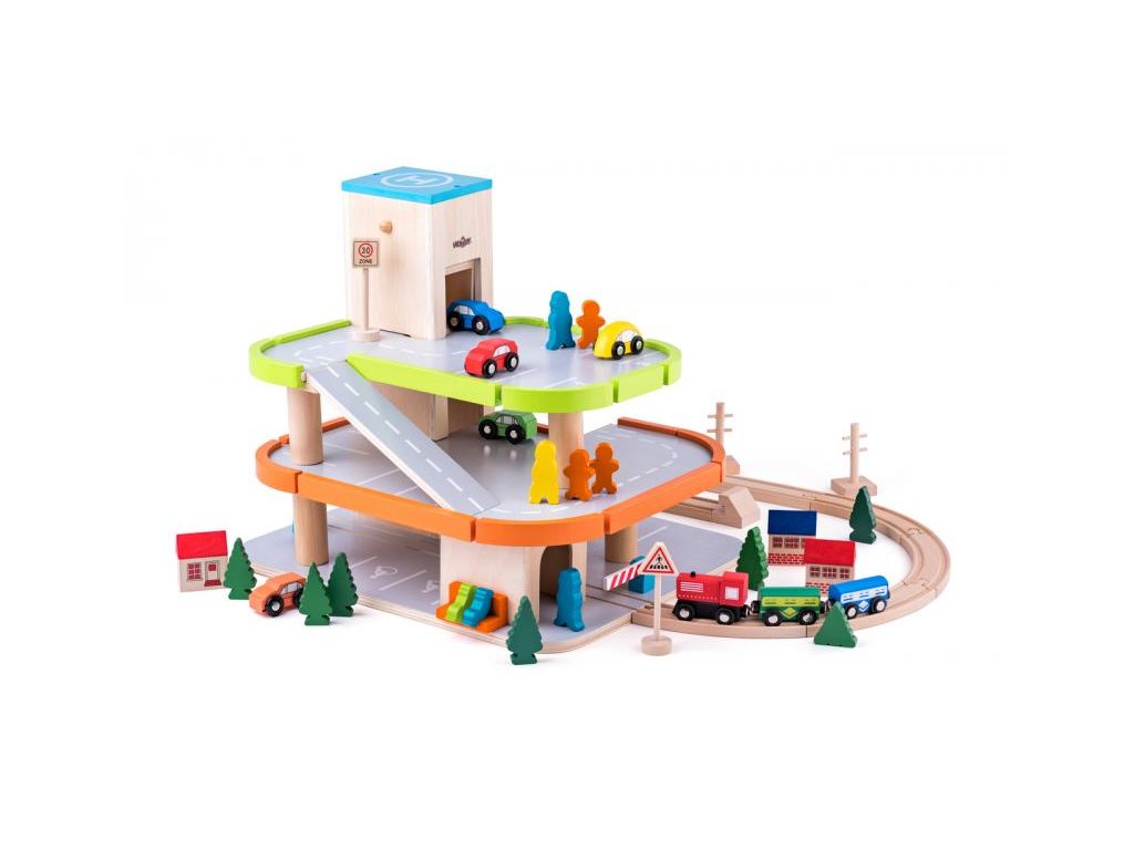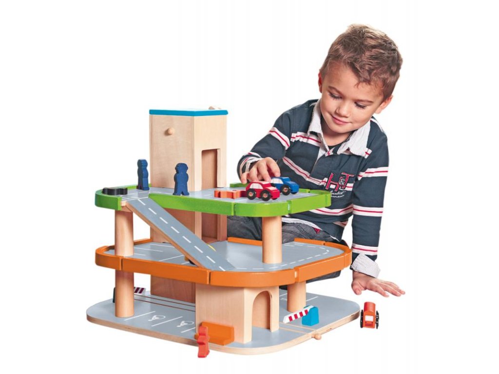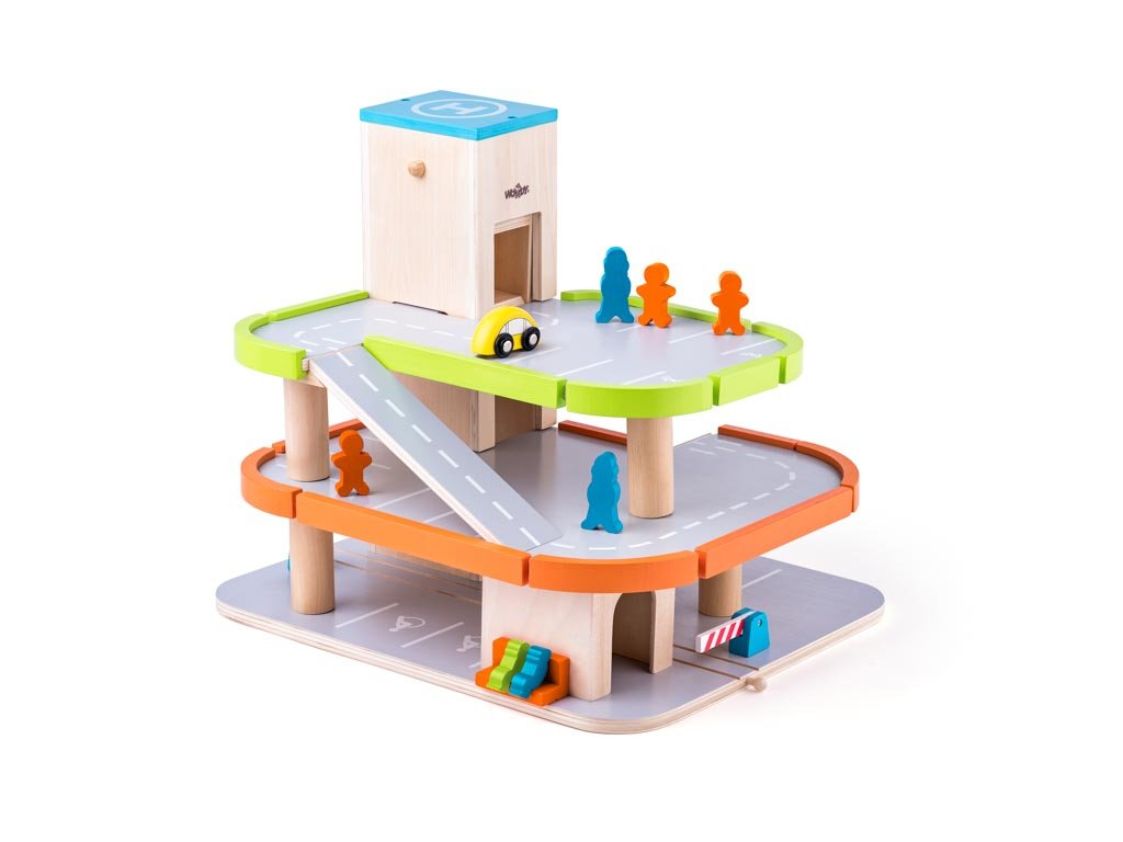 Dřevěná třípodlaží garáž Garáž je skvělým doplňkem k systému vláčkodráh. Má funkční výtah na kličku. Obsahuje: 1x závory, 1x auto, 4x stojící panáčka, 2x sedící panáčka. Vše je vyrobeno z kvalitního dřeva. Rozměr: 40 x 40 x 45 cm Věk 3+Doplňkové parametry