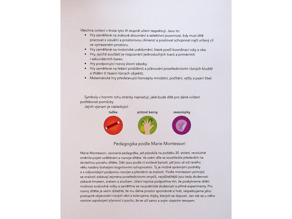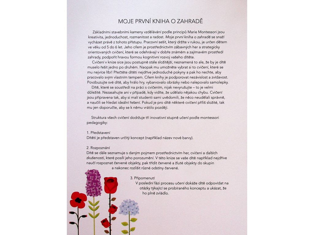 Moje první kniha - o domácích zvířatech Najde malý krteček Vilda v podzemním bludišti maminku? Poznáš stromy na zahradě podle jejich tvaru? Pomůžeš pavoučkovi Hugovi s pletením pavoučí sítě? Kniha dětem na základě principů montessori pedagogiky hravým způsobem ukáže, co všechno se může skrývat na zahradě u jejich domu. Kniha je sestavena dle Montessori svět úspěchu a je určená dětem mezi 3-4 roky. Autorem knihy je Chiara Piroddiová Počet stran: 48 Vazba: Kniha, paperback Rok vydání: 2018 Jazyk: česky Rozměr: 216 x 272 x 6 mm Hmotnost: 282gDoplňkové parametry