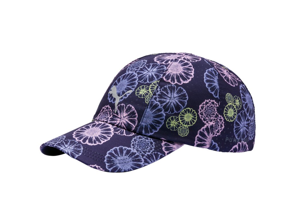 Dámská golfová čepice Puma Dámská golfová čepice Puma na denní nošení, Daily cap, je v krásném květovaném designu - tmavá modrá s květy v barvách světle modré, růžové a žluté. Má perforovaný materiál aby se hlava nepotila. Tenký perforovaný materiál dělá z čepice ideální parťačku na hru kde se nemusíte po hře bát sundat čepici v klubovně. Velikost je univerzální dámská, lze vzadu upravovat páskem. K čepici je možno zakoupit ve stejném designu i golfové šaty nebo golfové tričko.Doplňkové parametry