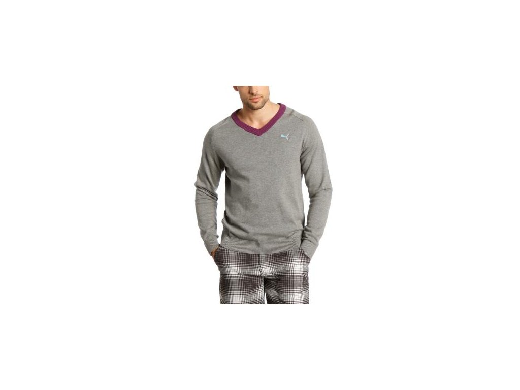 Golfové oblečení Puma Pánský golfový svetr Pumagolf ve stylu Sport Lifestyle, u krku do "V" v šedo fialové barevné kombinaci. Středně teplý svetr vyroben z 100% bavlny.Doplňkové parametry