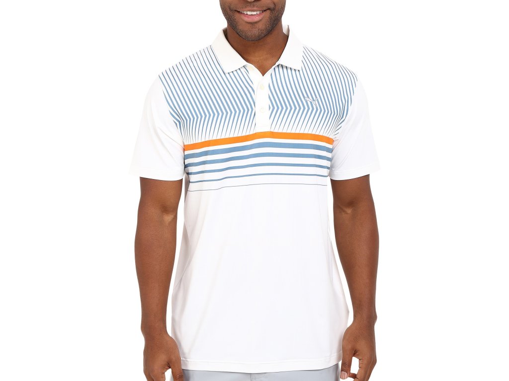 Golfové oblečení Puma Pánské goflové tričko Puma Surface Stripe Polo v bílé barvě s modro oranžovým designem na přední straně trička. Tričko je z hladkého jemného materiálu, dobře vede pot a hodí se k mnoha barvám kalhot i šortek jako např. k bílé, oranžové, modré, černé, šedé atd. Tričko má štíhlejší sportovní střih. Materiál: 92% polyester, 8% elathaneDoplňkové parametry
