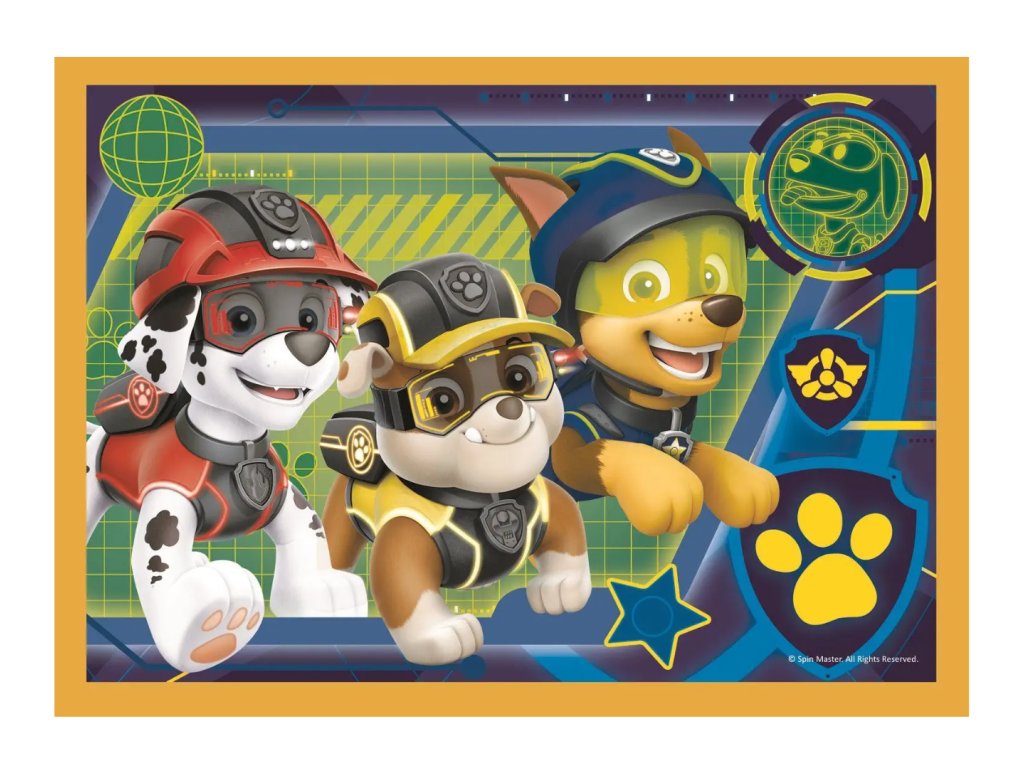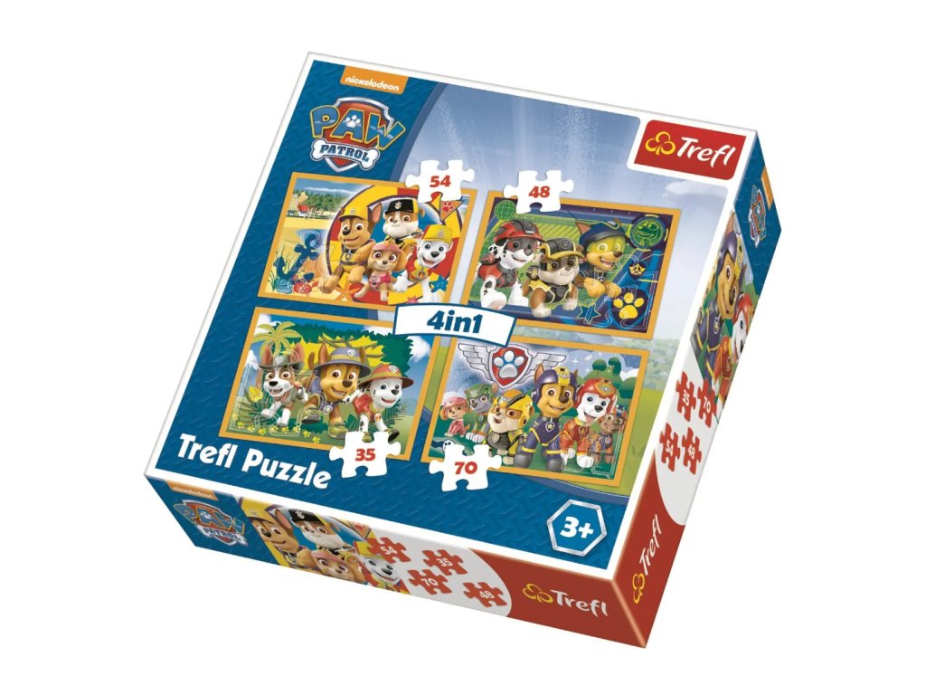Puzzle Tlapková patrola Vždy včas - 4v1 Poznejte neohrožené psí záchranáře Rockyho, Skye, Marshalla, Rubblyho, Zumu a Chase, kteří se vždy vrhají do nebezpečí aby chránili svět. Puzzle mají různou obtížnost, podle počtu dílků, v balení najdete obrázek s 35, 48, 54 a 70 dílky. Obrázky jsou stejně veliké, mění se jen velikost jednotlivých dílků. Díky tomu si vaše dítě může postupně trénovat soustředěnost i trpělivost při skládání.Doplňkové parametry