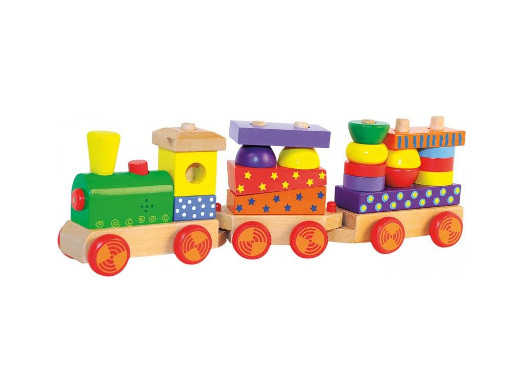 Dřevěný skládací vlak se zvuky Dřevěný skládací vlak se skládá z mašinky a dvou vagónků. Na každou část se dají různě naskládat barevné kostky a tvary ( celkem 12 ks). Lokomotiva svítí a hraje při zmáčknutí komína. Baterie 2x AAA jsou součástí balení. Rozměry: 43 x 13,5 cm. Věk 2+Doplňkové parametry