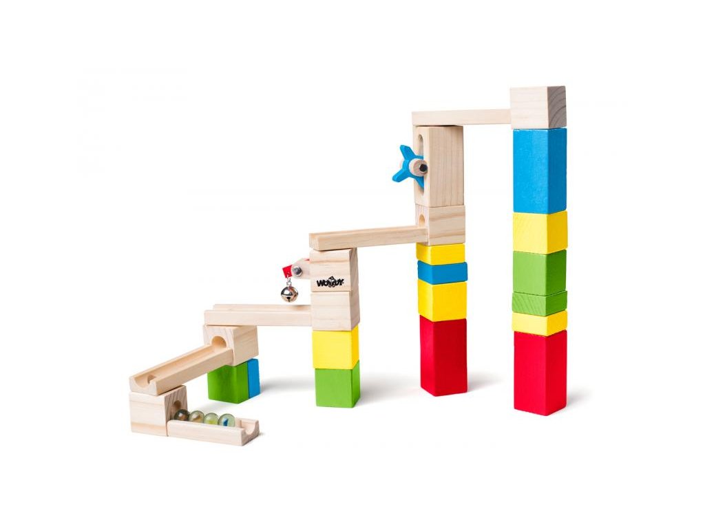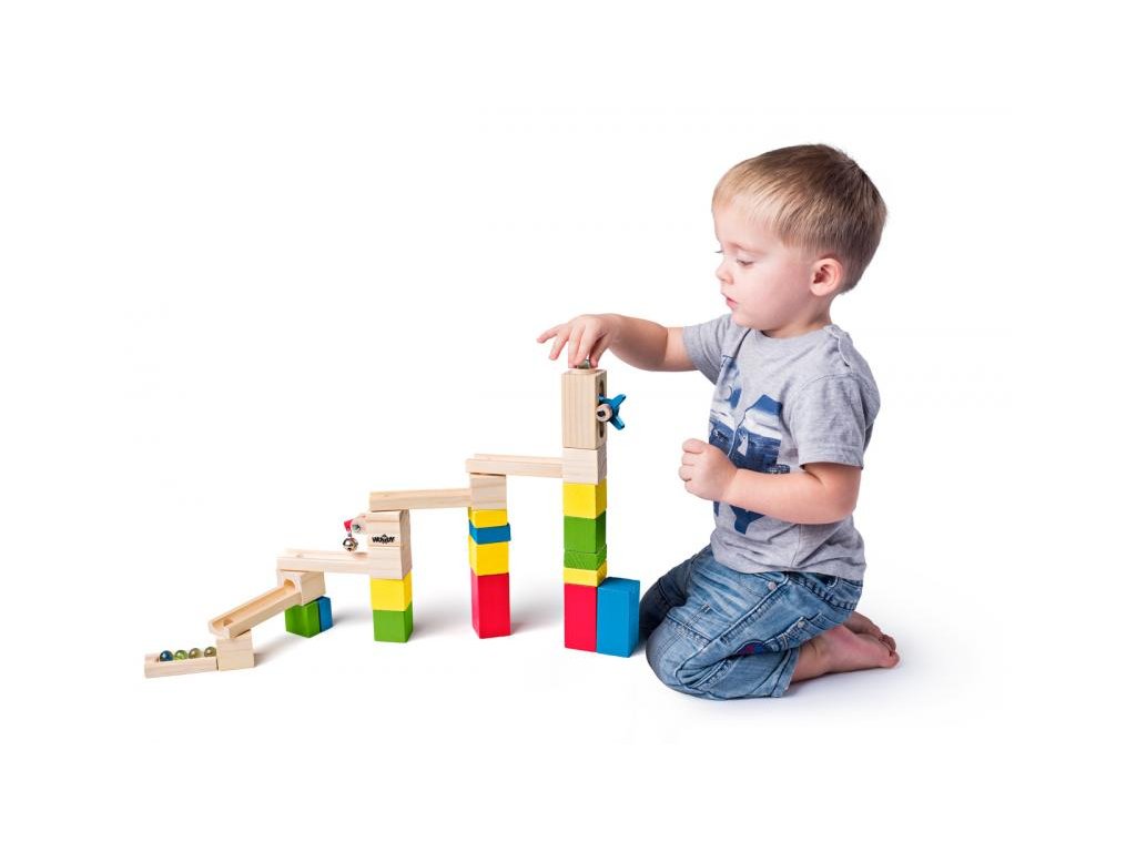 Dřevěná kuličkodráha Dřevěná stavebnice, ze které si postavíte kuličkovou dráhu. Fantazii se meze nekladou. Stavebnice je vhodná pro rozvoj logiky i motoriky dítěte. Doporučený věk 3+. Stavebnice obsahuje kuličky, které by mohlo mladší dítko vložit do úst.Doplňkové parametry